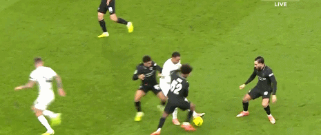 第40分鐘,扳平比分,多庫(kù)內(nèi)切后射門擊中后衛(wèi)折射入網(wǎng),曼城1-1