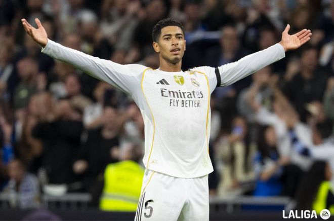 皇馬攻勢不減,第43分鐘,貝林厄姆橫向盤帶后突施冷箭,皮球直鉆死角。