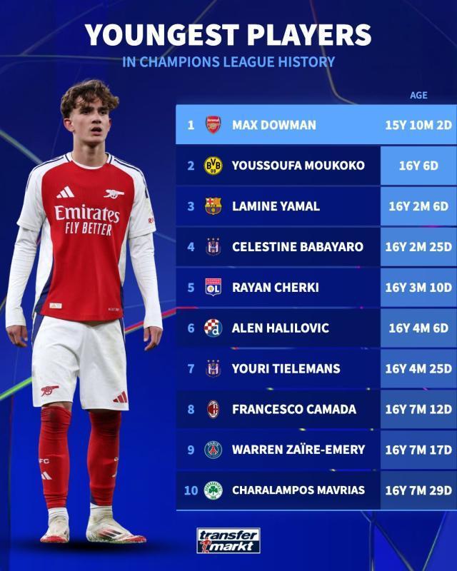 至此,槍手成為1969-70賽季的利茲聯(lián)后,史上第2支在單季歐冠前4場(chǎng)比賽全勝且不失一球的英格蘭球隊(duì)。此外,槍手還貢獻(xiàn)了一個(gè)歷史之最:小將道曼此役替補(bǔ)登場(chǎng),超越穆科科和亞馬爾等人,以15歲308天的年齡,成為冠軍聯(lián)賽歷史上最年輕的出場(chǎng)球員。