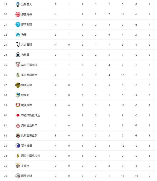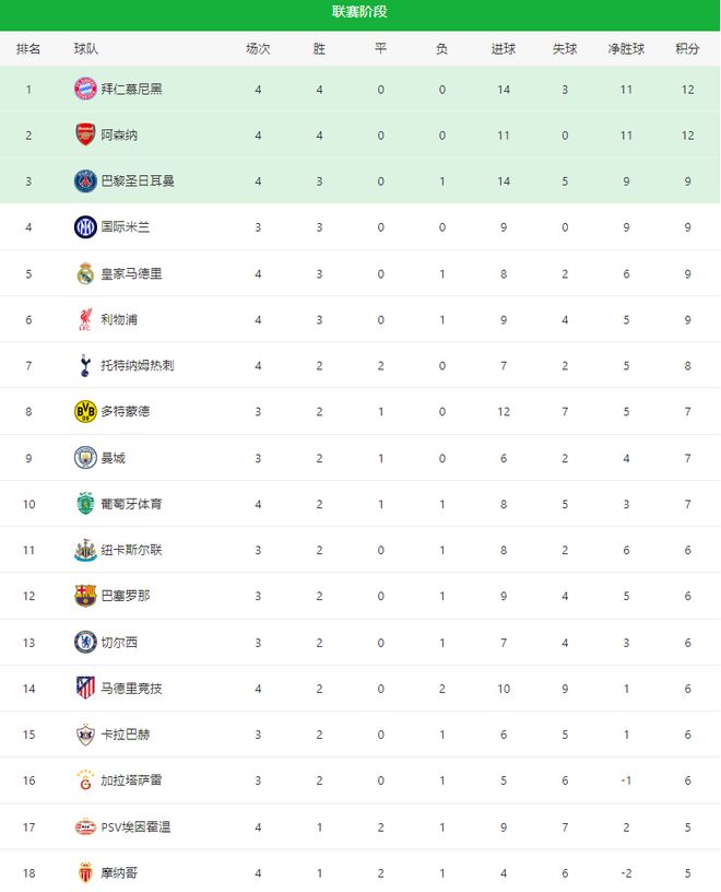 隨著拜仁2-1巴黎,利物浦1-0皇馬,歐冠最新積分榜:阿森納升第二